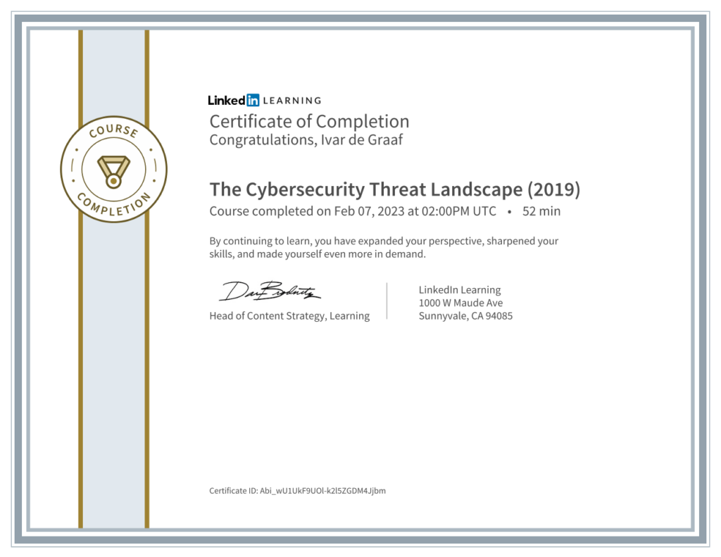 De LinkedIn-cursus “Learning The Cybersecurity Threat Landscape” uit 2019, gegeven door Marc Menninger, biedt een diepgaande blik op de meest voorkomende cybersecuritydreigingen zoals phishing en ransomware, evenals nieuwere aanvalsvectoren zoals cryptojacking, cloud-gebaseerde bedreigingen en onbeveiligde IoT-apparaten. De cursus benadrukt het belang van het beschermen van organisatiegegevens en leert de beste tegenmaatregelen om de impact van deze bedreigingen te verminderen of te elimineren. Klik op onderstaande certificaat om naar de officiële pagina te gaan van LinkedIn Learning