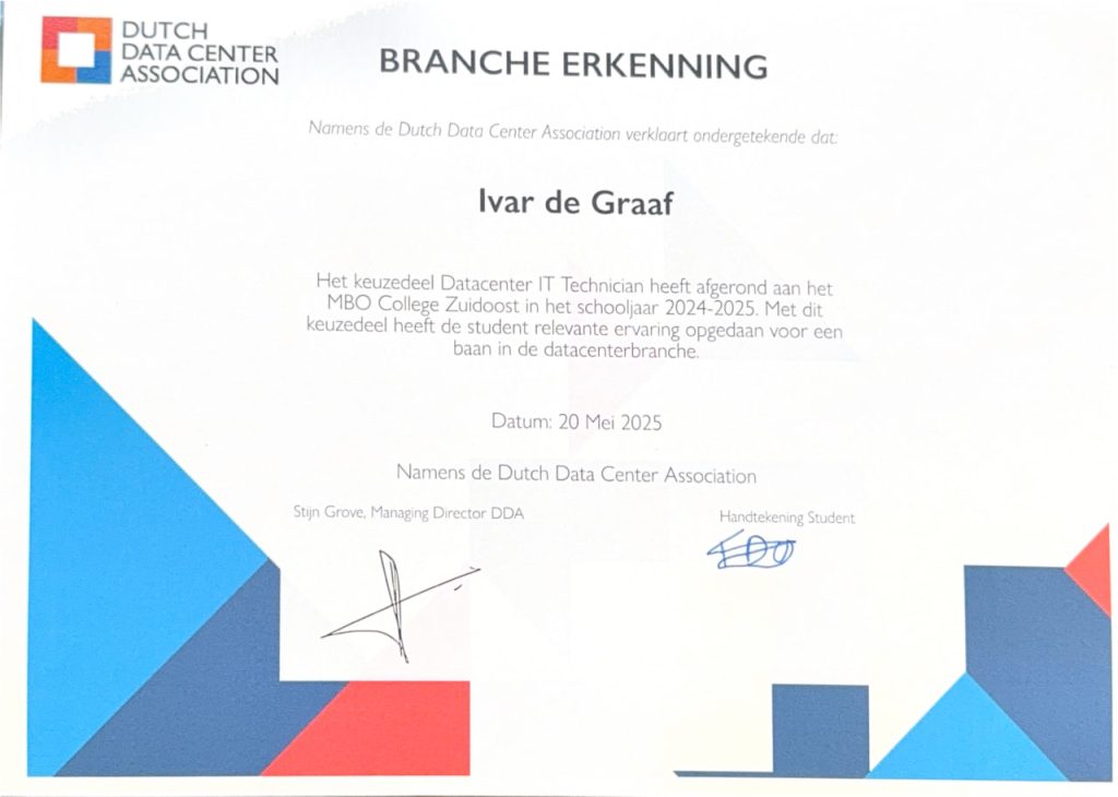 Deze badge bevestigt dat ik de kernleerdoelen en praktische lab-activiteiten van het Datacenter Academy-traject heb voltooid. Tijdens de opleiding heb ik praktijkgerichte kennis en vaardigheden opgedaan op onderwerpen zoals de rol en basisprincipes van datacenters, fysieke infrastructuur (racks en bekabeling), stroomvoorziening (UPS, batterijen), generatoren, koelsystemen, brandbescherming, monitoring en basis operationele procedures en veiligheidsrichtlijnen. De trainingsmaterialen combineren theoretische modules met hands-on labwerk en operationele oefening.